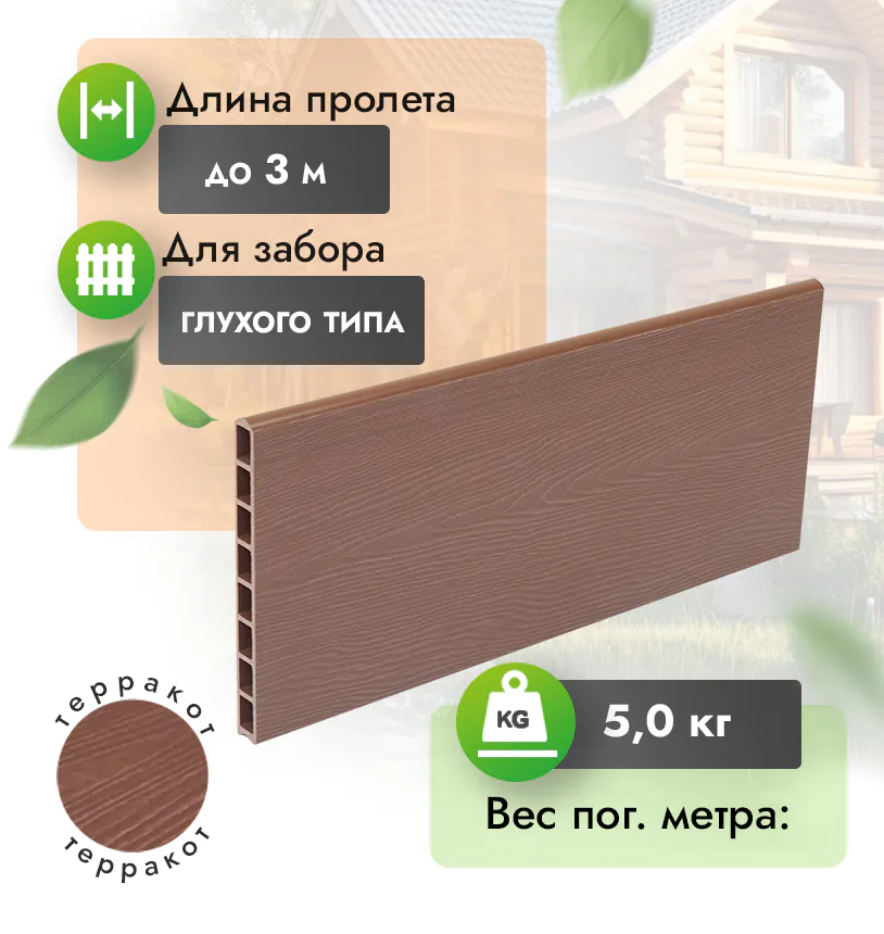 Наши заборные доски из ДПК выдерживают до 3318 кг/м2, влагостойкие, не требуют ухода.